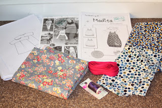 | Meisjespakketje Patroontje besteld bij Knippie, 2 patroontjes die ik zelf ooit won bij Creatinneling Bloemetjesstof Paarse stikgaren, roze biaisband, een overschotje stof van een kleedje en portefeuille het overschotje van de portefeuille |